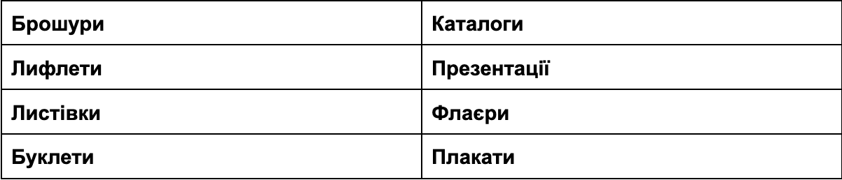 Кількість сторінокНаприклад, якщо це матеріали, які скріплюються скобою (каталог або брошура), кількість сторінок завжди має бути кратною чотирьом (тобто, 4, 8, 16 сторінок і так далі). Також кількість сторінок впливає на фінальну вартість друкованого продукту.