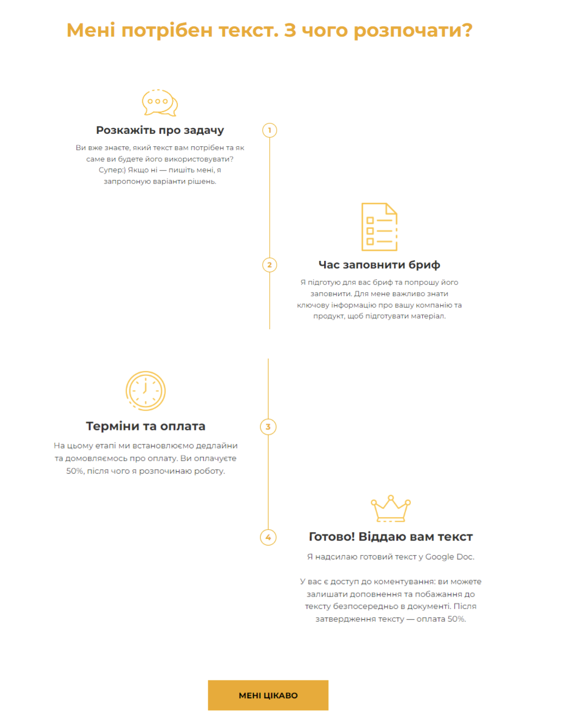 - яка задача перед тобою стояла (наприклад, написати текст для лендингу для збору реєстрацій на івент);