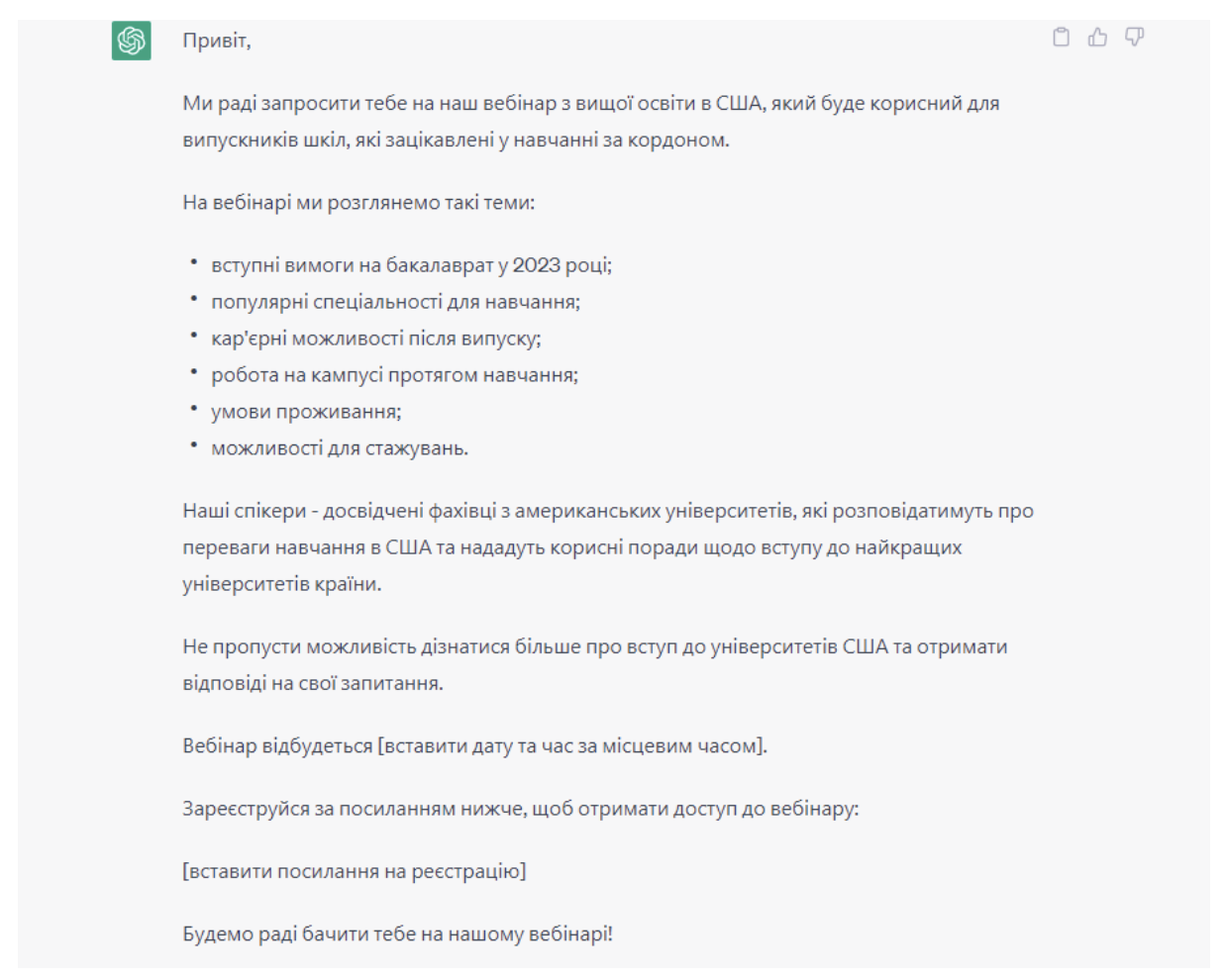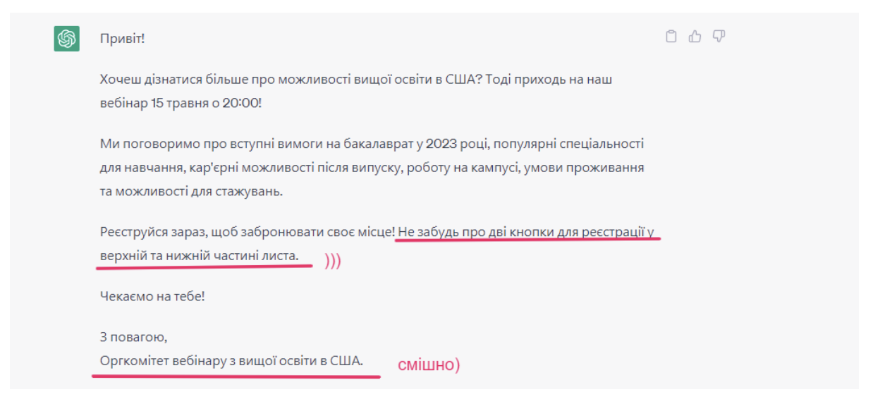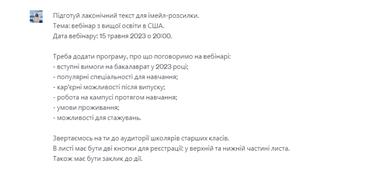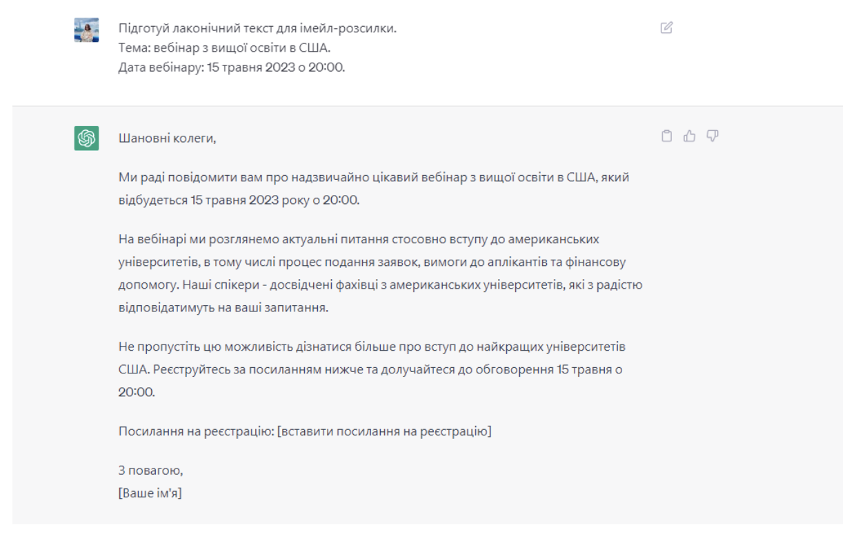 Прошу ChatGPT написати мені текст для імейл-розсилки.