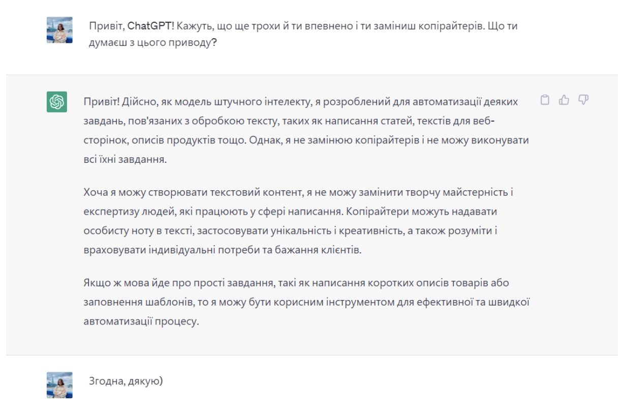 Зараз шириться думка, що ось-ось та нейромережі замінять копірайтерів. Ця думка зазвичай просувається людьми, які особисто жодного ставлення не мають до написання текстів. Але, ні. ChatGPT ніколи не замінить копірайтерів. Чому? Ось що він сам мені про це сказав ⤵️