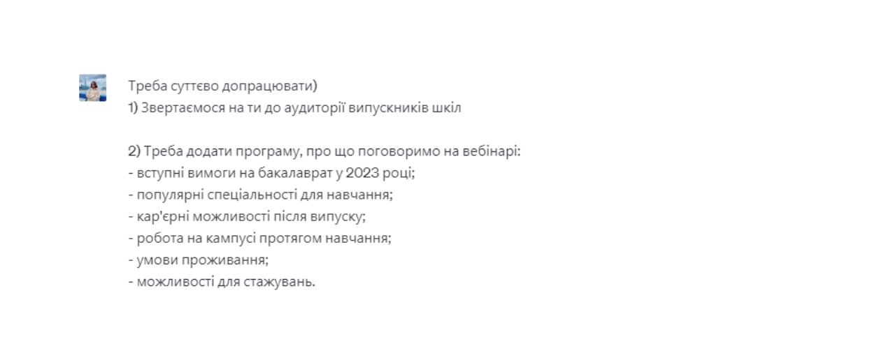 ✅ Це чудове джерело для натхнення. Наприклад, ти починаєш писати текст, але ідей — 0. Трапляється, що текст «не рухається з місця». Штучний інтелект може запропонувати класні ідеї, які ти можеш використовувати як відправні точки.