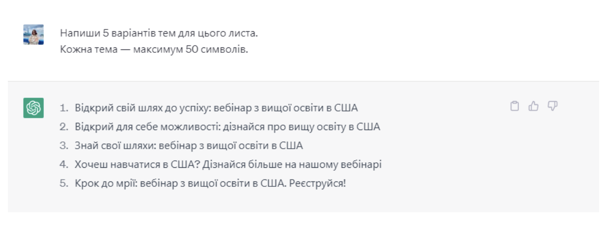 4️⃣ Втім, ми ще можемо попросити ChatGPT написати теми для листа
