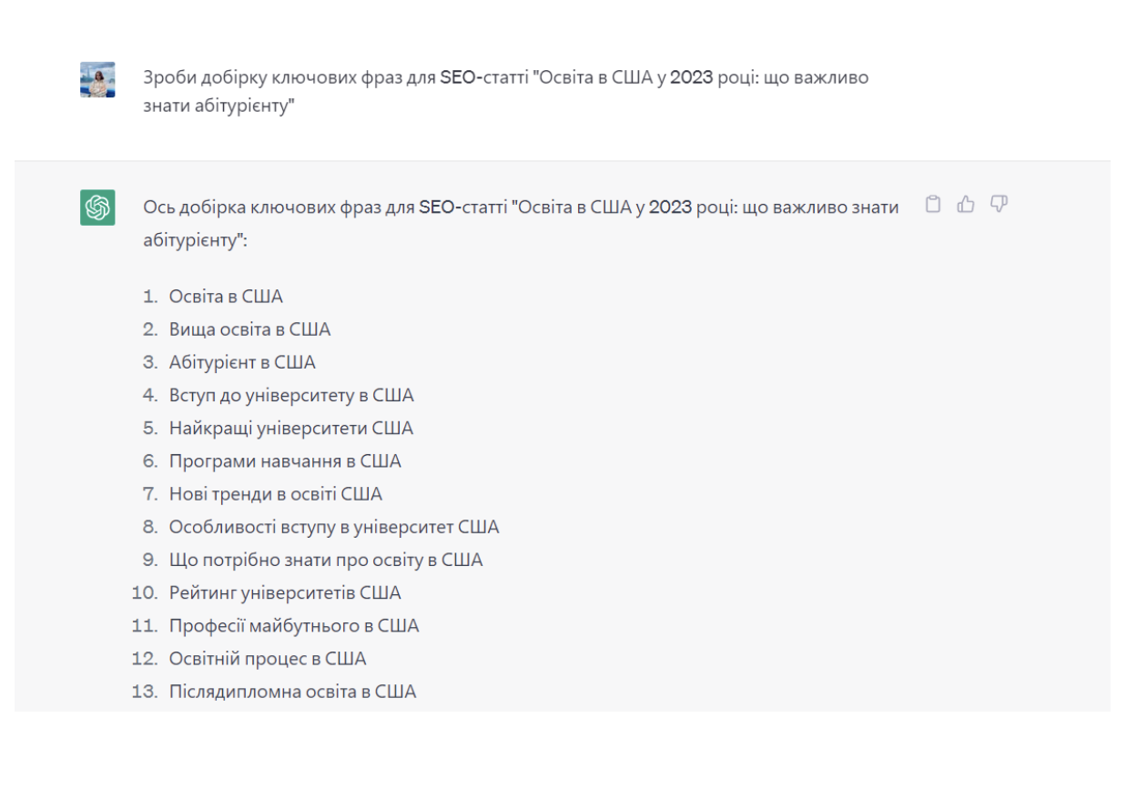 ✅ ChatGPT допоможе зробити добірку ключових слів та фраз для написання статей, наприклад ⤵️