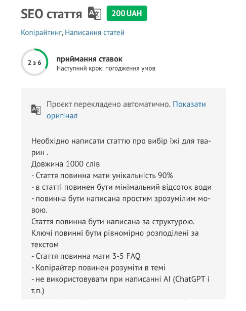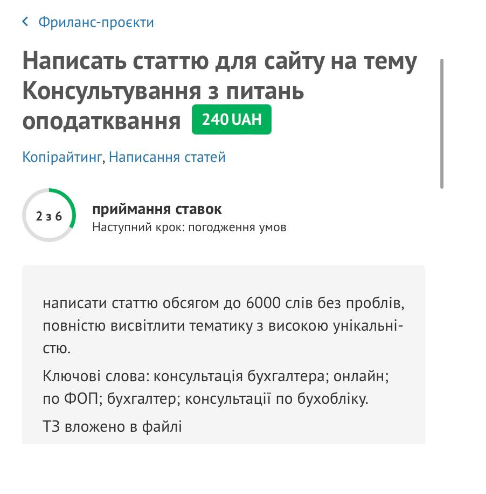 Фриланс-біржа — можливий етап для копірайтера-початківця, але я вважаю, що довго затримуватись на цьому етапі не варто. Чи готов(а) ти писати статтю обсягом до 6000 слів за 240 грн як на скріні вище? Не впевнена.