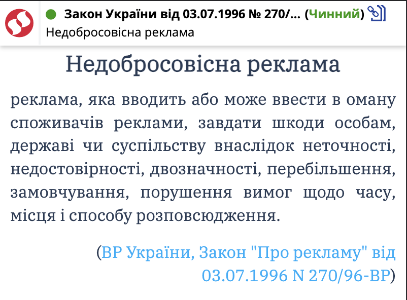 Окрім того, вся «найкраща» реклама, яка не підтверджена фактами, порушує Закон України «Про рекламу». Така реклама вважається недобросовісною.