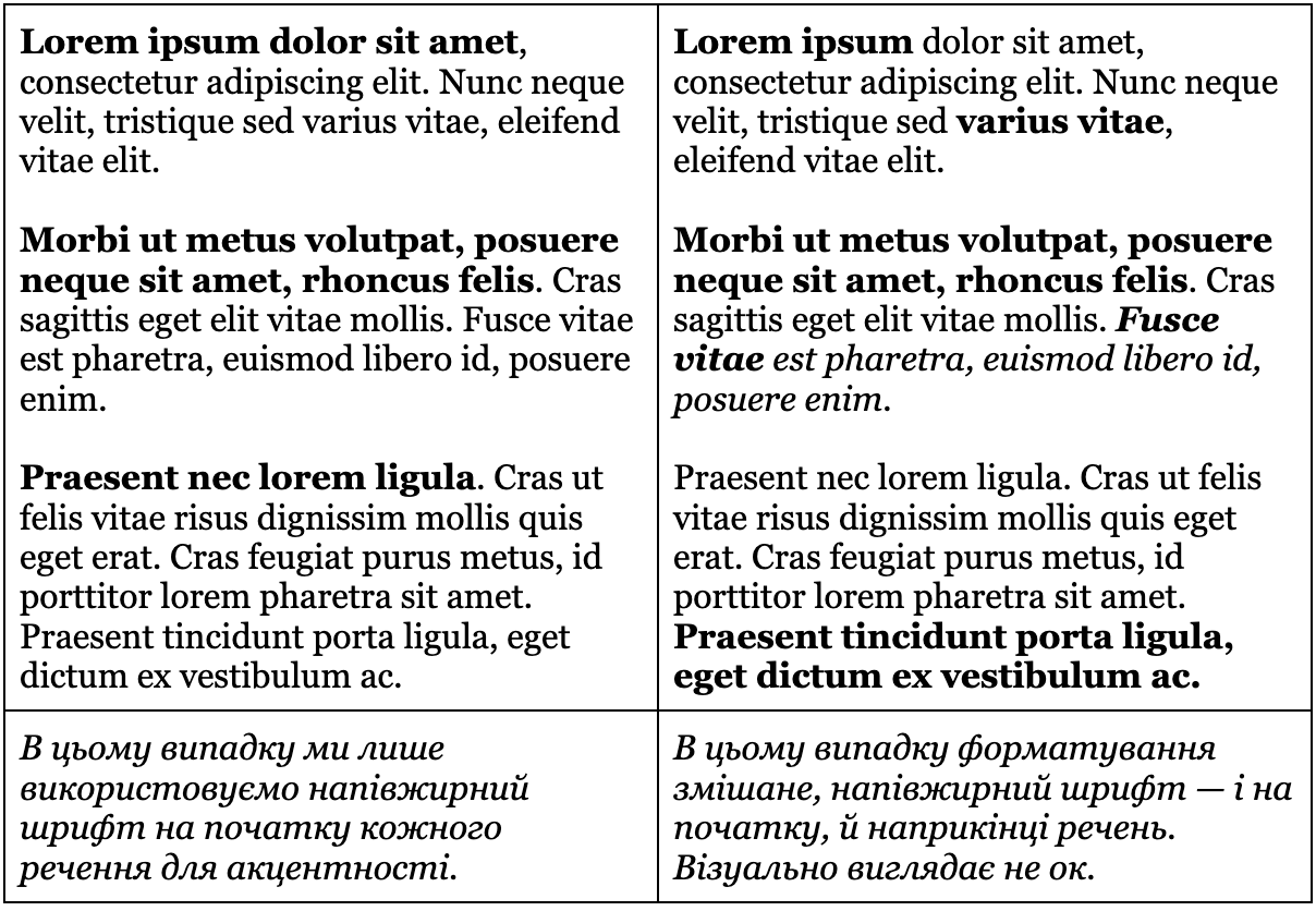 форматування — напівжирний, курсив;