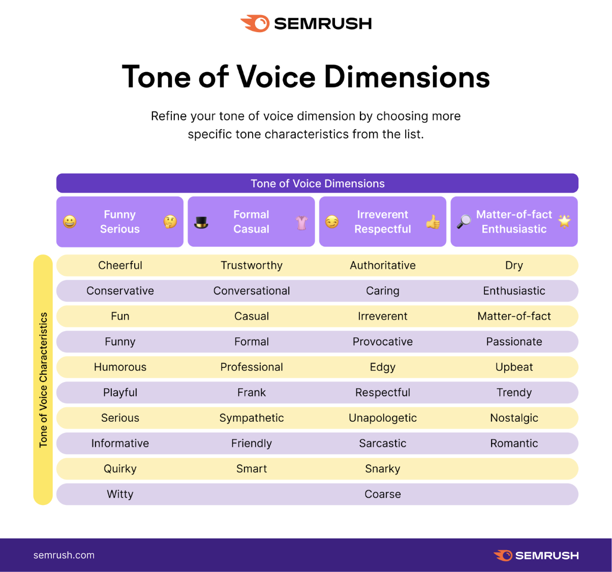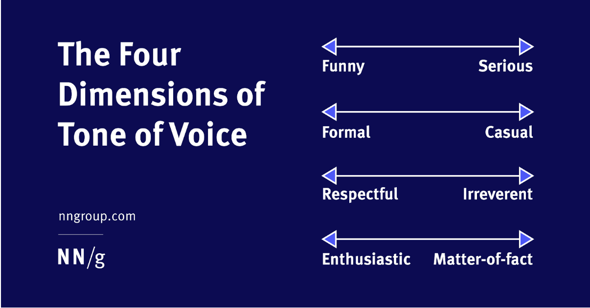 Як визначити TOV брендуМожна скористатися чотирма параметрами TOV від Nielsen Norman Group, щоб визначити, куди саме потрапляє бренд у кожній категорії.Згідно з Nielsen Norman Group, TOV бренду може бути:- смішним або серйозним;